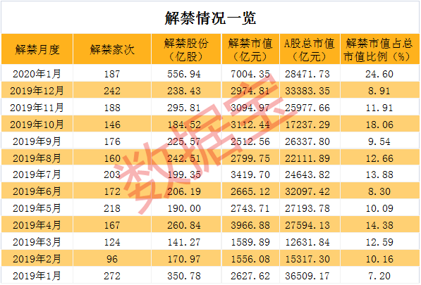 2020年1月A股共有187家次上市公司解禁,涉及股份557亿股,对比2019年全年,