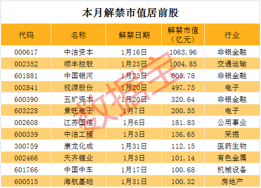 从市值的角度来看,以2019年12月31日的收盘价计算, 1月份有12股解禁市值超100亿元,包括顺丰控股、中国银河、视源股份和五矿资本等。排名靠前的两家更是超过1000亿元。居首的是中油资本,解禁市值为1063.94亿元,排名第二的是,顺丰控股,解禁市值为1004.85亿元。排名第三的是中国银河,解禁市值为605.78亿元。